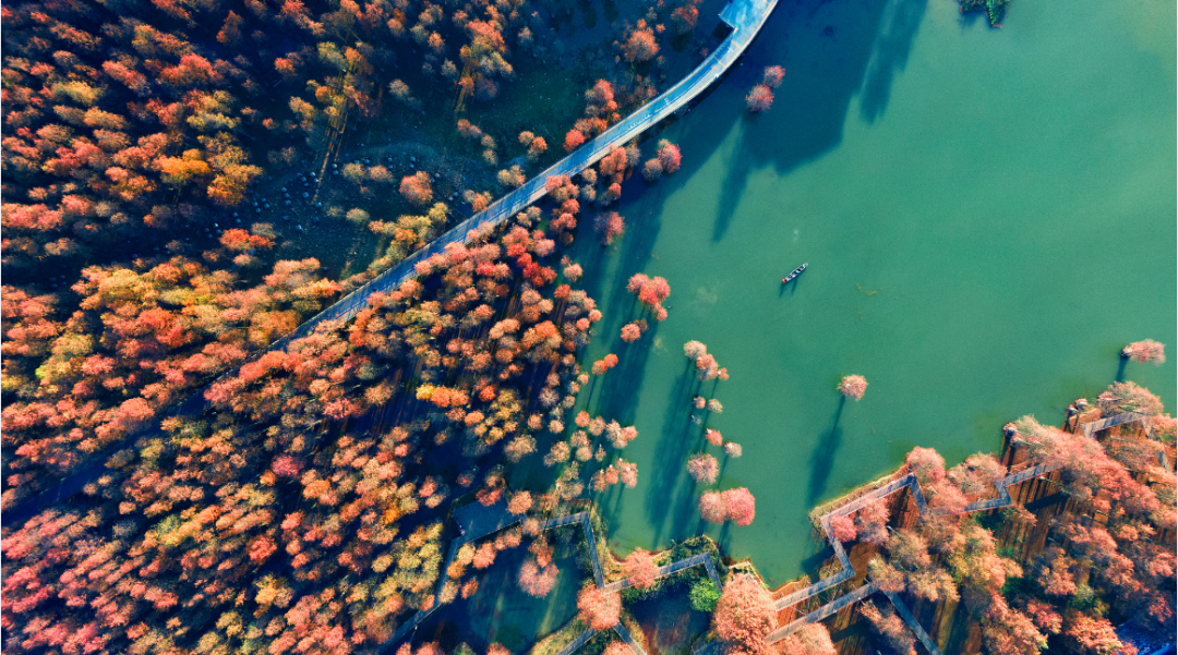 青山湖不仅有国内罕见的水上森林,一条42.195公里的环湖绿道串联起了人与自然,深入景区之中,便是“树在水中长,船在林间行,鸟在枝上鸣,人在画中行”的美妙情景。