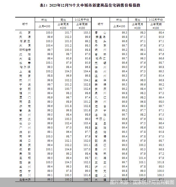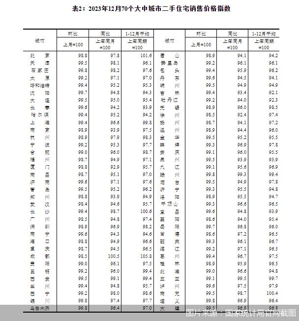 1 月 17 日,国家统计局发布最新一期 70 城二手房价格指数,全国 70 个城市的二手房自 2014 年 10 月以来首次全部下跌。其中,北上广深等一线城市也延续跌势,从同比看,12 月一线城市二手住宅销售价格同比下降 3.5%,降幅比上月扩大 0.6 个百分点,北京、上海、广州和深圳分别下降 2.2%、3.4%、5.2% 和 3.1%。业内人士指出,12 月全国市场房价底部盘整趋势不变,由于岁末年初楼市热度都相对较低,预计要等到 2024 年开春市场才会逐步迎来反转。