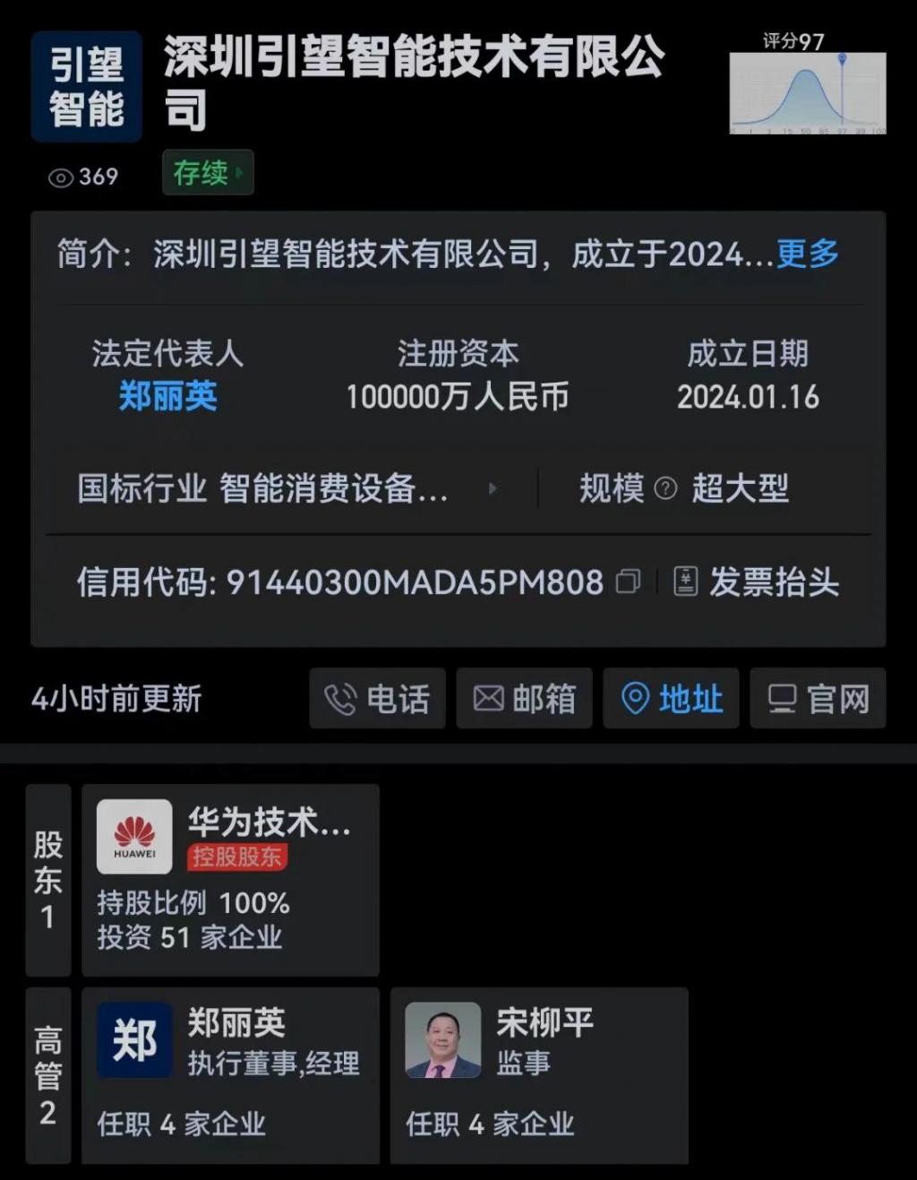 另据中国基金报报道,工商信息显示,1 月 16 日,深圳引望智能技术有限公司成立,其注册资本为 10 亿元人民币。