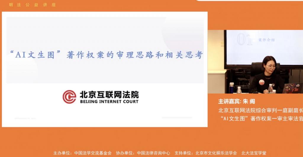 1 月 12 日下午,全国首例 AI 生成图侵权案一审主审法官、北京互联网法院综合审判一庭副庭长朱阁做客中国法学交流基金会举办的公益讲座,就 " 人工智能生成图著作权相关问题 " 回应公众关切。