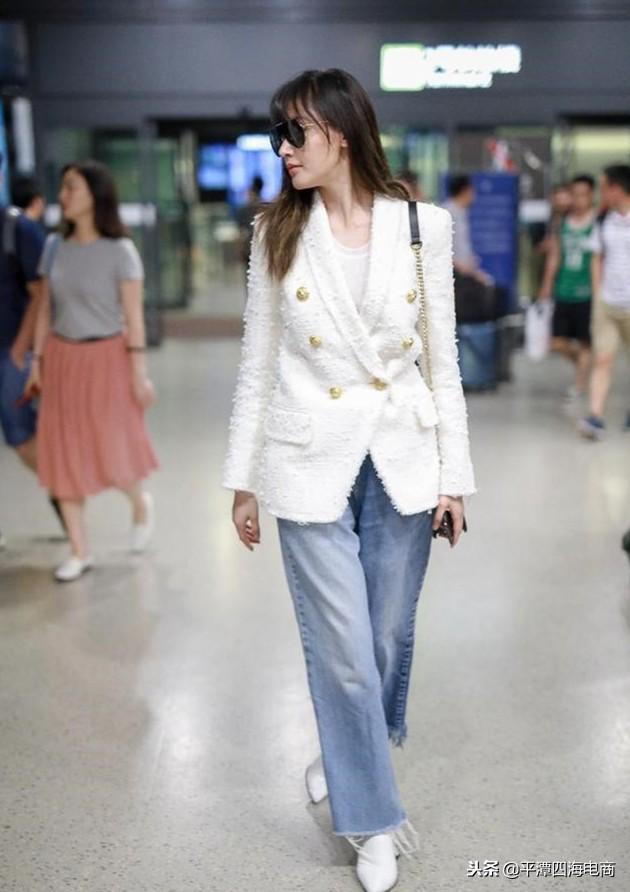 这款浅色的牛仔阔腿裤搭上白色短外套,全身浅色look,这样搭配,看过去特别小清新。但是但是全浅色的look要加入些特色才更显眼,比如在外套上加入金色的扣子,可以加分不少。脚上pick的是白色的尖头鞋,可以增加不少女人味哦。