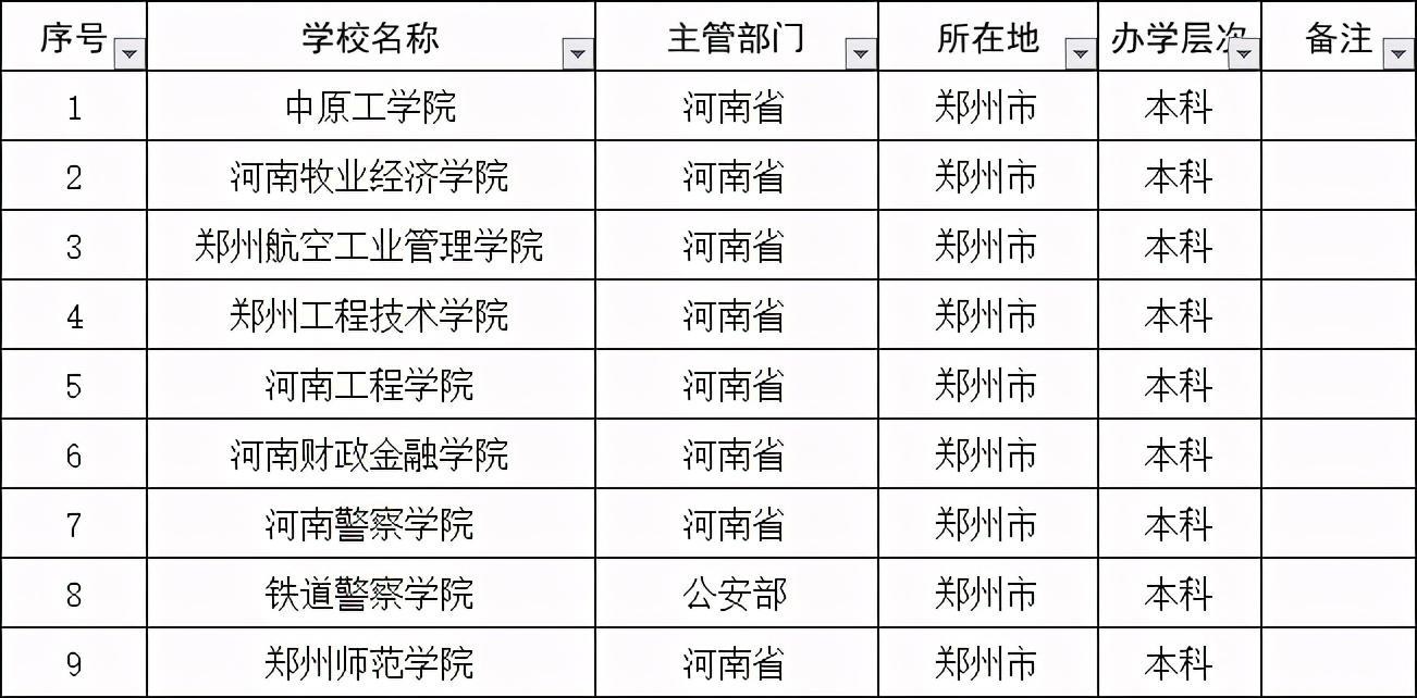 如上图所示,办学地在郑州的本科院校有26所,其中公办院校16所、民办院校10所。这26所本科院校中属于一本院校的有郑州大学、华北水利水电大学、河南工业大学、郑州轻工业大学、河南农业大学、河南中医药大学和河南财经政法大学7所院校,属于三本院校的有河南师范大学新联学院,其余均为二本院校,共有18所。剩下的18所二本院校中,除去民办本科以外,就剩下中原工学院、河南牧业经济学院、郑州航空工业管理学院等9所院校,具体名单如下:
