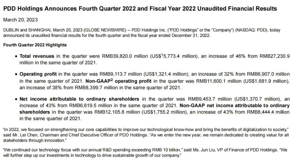 据澎湃新闻,3 月 20 日,在拼多多财报发布后的电话会议上,拼多多集团董事长、首席执行官陈磊表示:" 四季度,我们看到了消费需求的回归与释放。我们加大了平台补贴的普惠力度,也很高兴能在提振消费信心方面贡献平台的力量。我们将持续投入,更好地满足消费者对品质与价格的双重期待。"