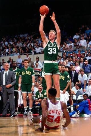 拉里-伯德身高约2米06,体重约100KG,他以一个前锋身高,经常飘在外线,并且投篮精准,职业生涯两分球命中率为惊人的50.9%,三分球命中率为37.6%高瘦远投王的称号当之无愧。