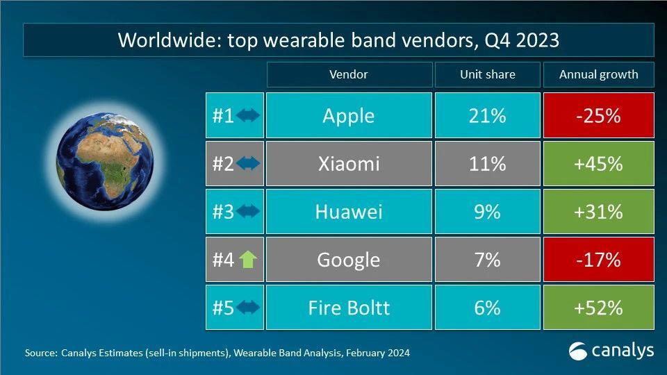 国产崛起?全球智能穿戴出货量小幅下跌,小米、华为逆势上涨