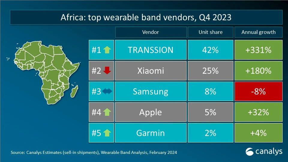 小米的智能穿戴产品以其性价比高、功能全面而受到消费者的青睐,尤其是在海外市场,小米的市场策略起到了关键作用。在这个季度中,小米的智能穿戴产品在海外出货量提升明显,其中提升最大的是非洲和拉丁美洲市场,分别提升了 180% 和 96%。