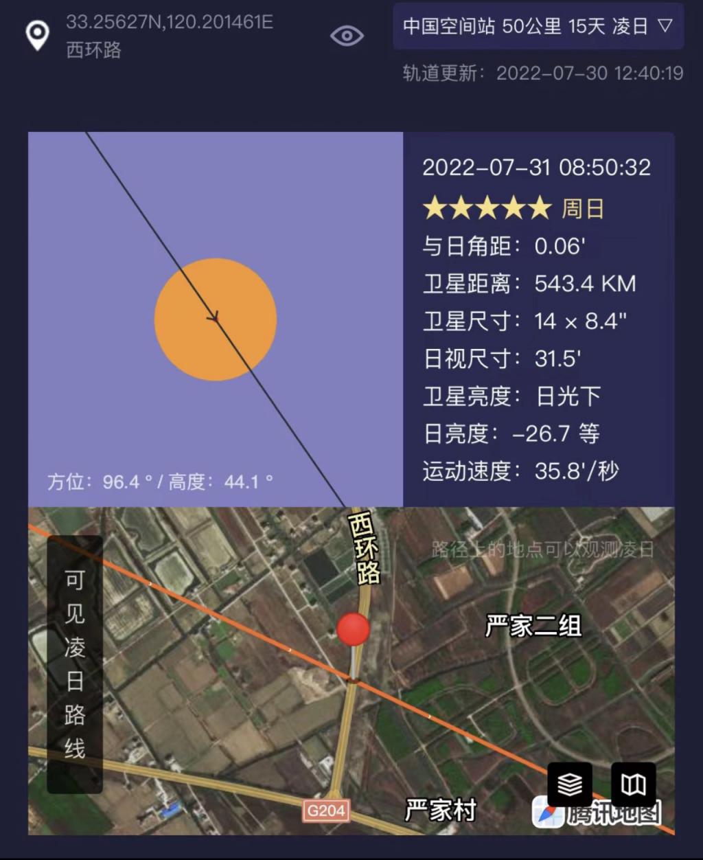 7 月 30 日,大可根据天文通微信小程序,了解到 31 日上午 8 点 50 分左右,中国空间站会在盐城凌日,便提前定好闹钟准备第二天拍摄。