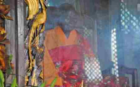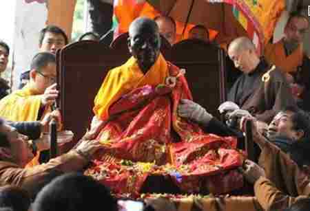 然后由他的门人抬进两个对合密封大缸之中的木座上,座下有生石灰和木炭,座上有排漏孔。经过一段时间,内腊和尸体上的有机物质腐烂流滴到生石灰上,水份被渐渐吸乾,变成极似六祖生前容貌的“真身”。