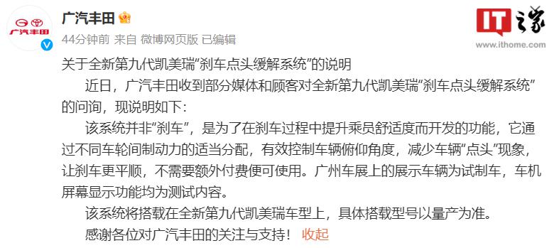 广汽丰田回应新凯美瑞刹车点头缓解系统收费:测试内容,无需付费