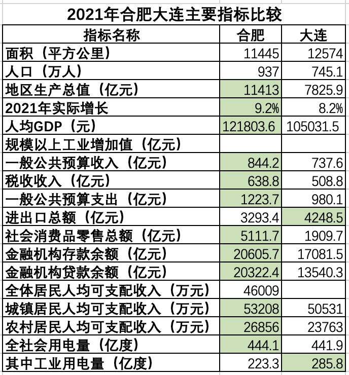 但是大连市跟最近几年崛起的“霸都”合肥市相比,还是存在较大的差距,我们看两座城市的主要经济指标比较。