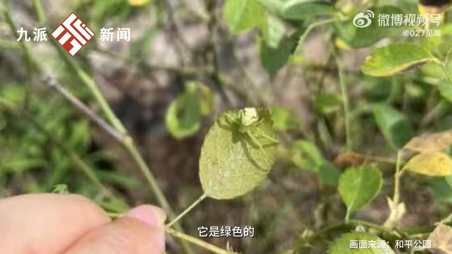 8月1日,武汉和平公园里出现一只长相怪异的虫子,该虫通体绿色,四对足长短不一,腹部花纹似人脸模样,因花纹似人脸,所以被人们称为“人面蜘蛛”。