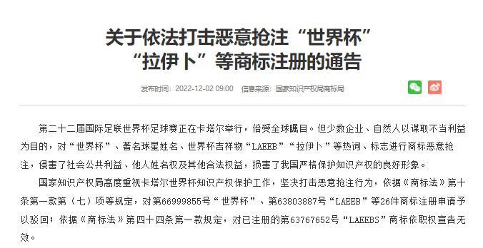 12 月 2 日,国家知识产权局发布关于依法打击恶意抢注 " 世界杯 "" 拉伊卜 " 等商标注册的通告。多家公司及自然人抢注的 " 世界杯 "" 拉伊卜 ""C 罗 "" 梅西先生 " 等相关商标已标记无效。