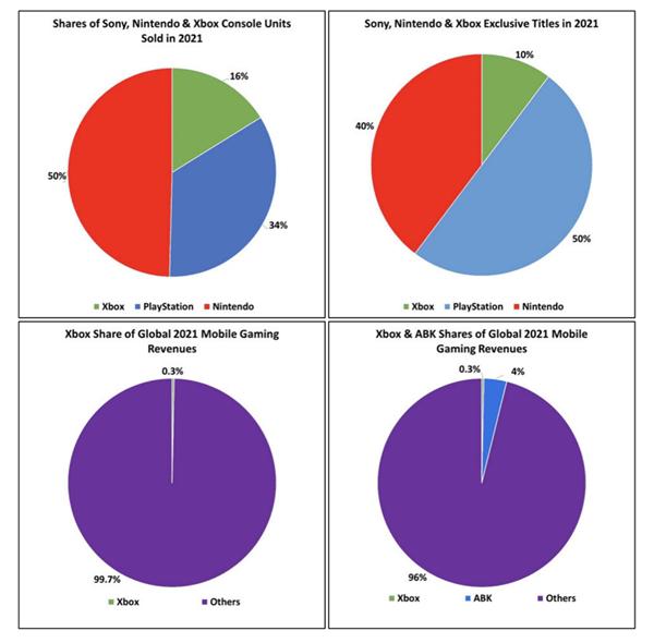 微软甚至还把手游都拉出来算了,Xbox 只占全球手游收入的 0.3%,就算是收购了动视暴雪,加起来的份额也不过 4.3%,这个份额连垄断的毛皮都算不上。