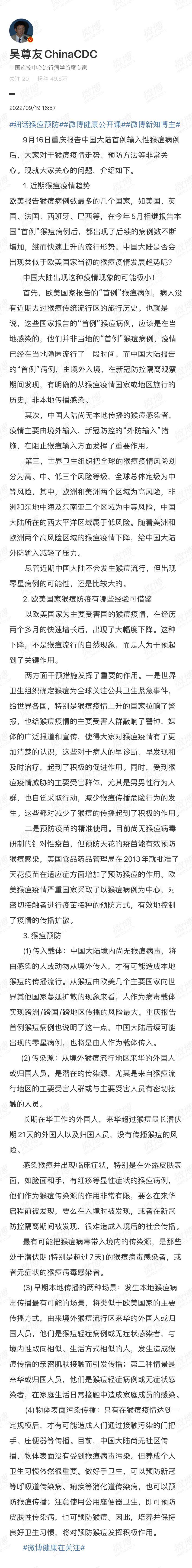 9 月 19 日,中国疾控中心流行病学首席专家吴尊友通过其个人微博就 16 日重庆报告中国大陆首例输入性猴痘病例后,猴痘疫情走势、预防方法等问题进行介绍,其中提到: