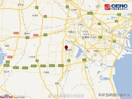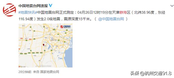 中国地震台网正式测定:04月26日12时19分在天津静海区(北纬38.96度,东经116.94度)发生2.0级地震,震源深度15千米。( @中国地震台网 )