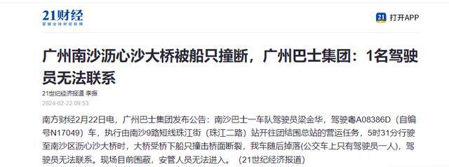 2 月 22 日,广州巴士集团发布公告:南沙巴士一车队驾驶员梁金华,驾驶粤 A08386D ( 自编号 N17049 ) 车,执行由南沙 9 路短线珠江街 ( 珠江二路 ) 站开往团结围总站的营运任务,5 时 31 分行驶至南沙区沥心沙大桥时,大桥受桥下船只撞击桥面断裂,我车随后掉落 ( 公交车上只有驾驶员一人 ) ,驾驶员无法联系。现场目前围蔽,安管人员无法进入。