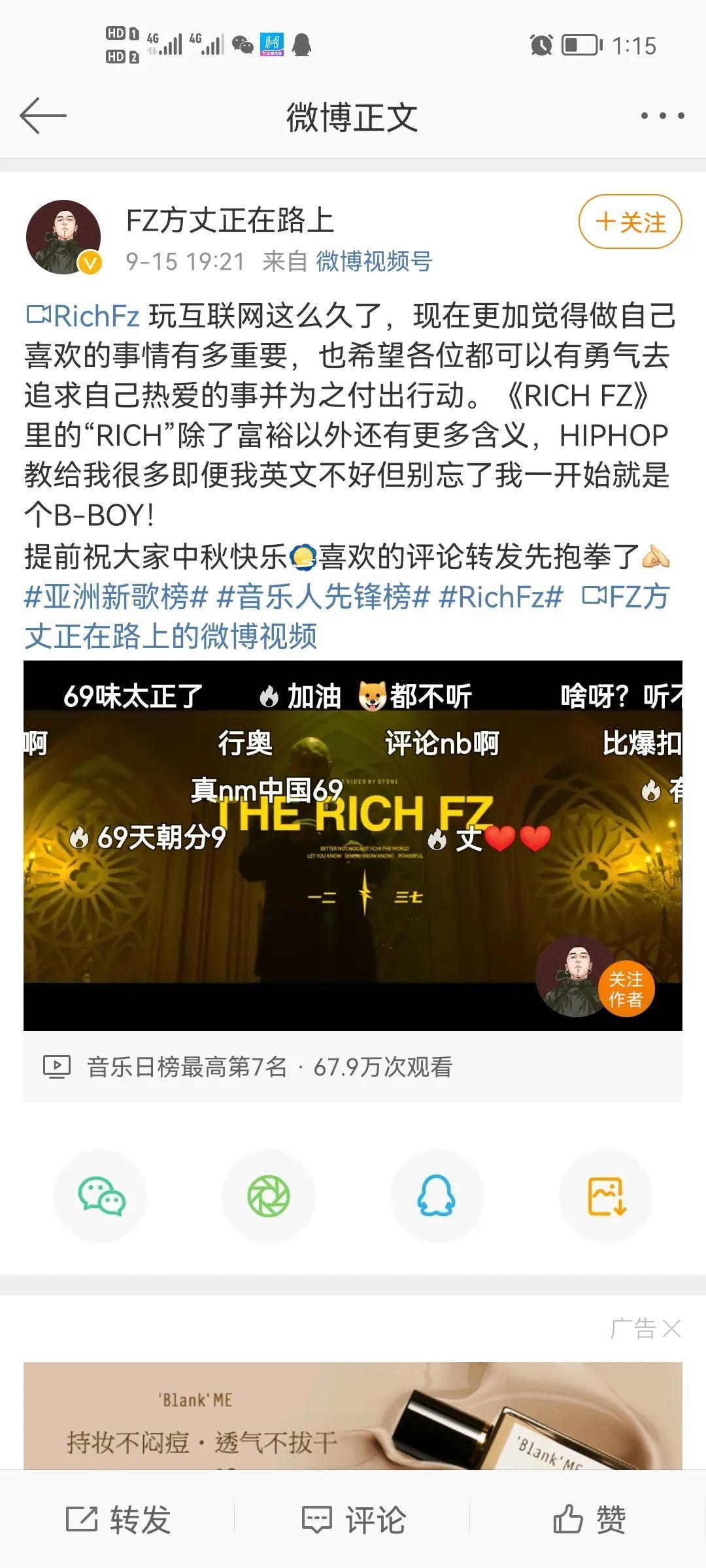 9月15日,方丈在微博上发了自己的新歌《RICH FZ》,李京泽转发了这首新歌,并配文:“预告一下我们的歌”