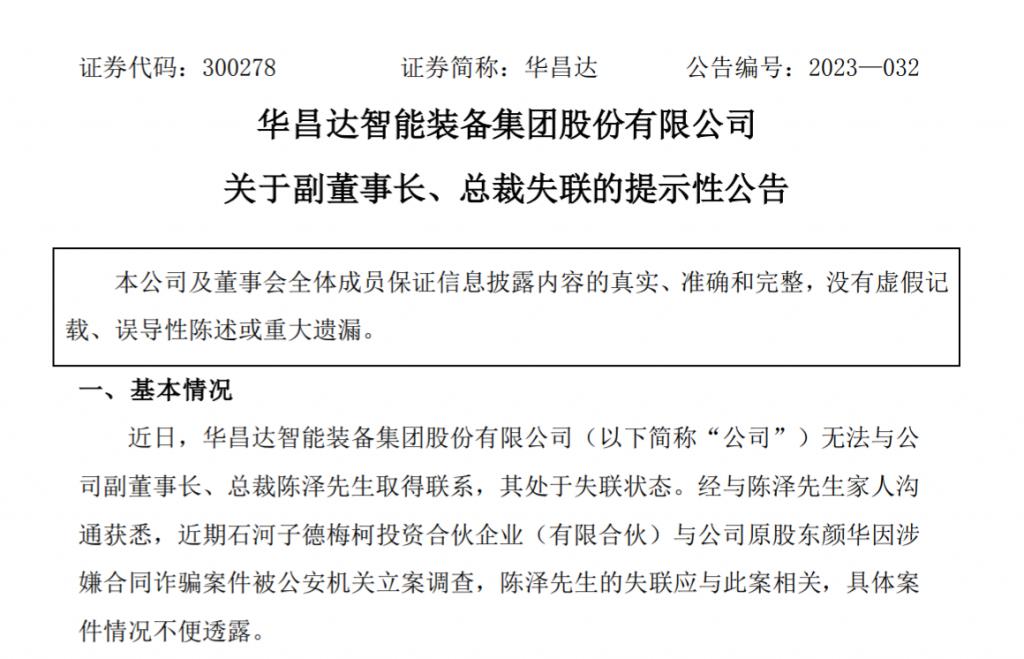 华昌达表示,经与陈泽家人沟通获悉,近期石河子德梅柯投资合伙企业(有限合伙)与公司原股东颜华因涉嫌合同诈骗案件被公安机关立案调查,陈泽的失联应与此案相关,具体案件情况不便透露。