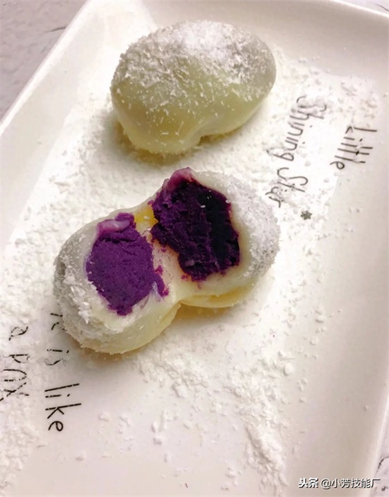首先准备好所有的食材,如下图所示。小贴士:糯米粉150克,糖粉40克,水150克,黄油40克,紫薯一个,奶粉15克。