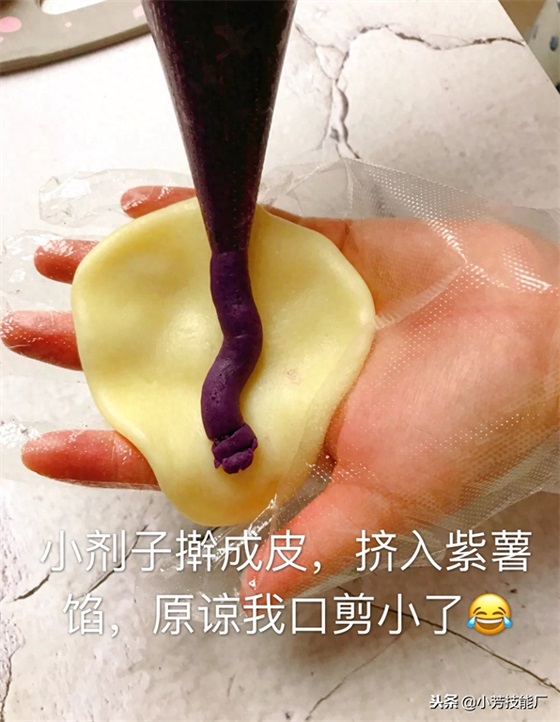 然后将小剂子擀成皮,挤入紫薯馅,如下图所示。