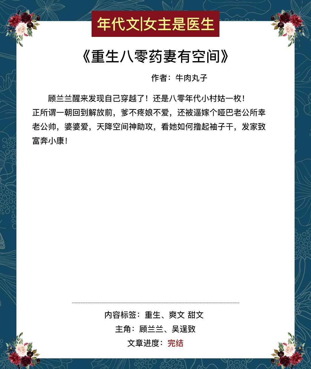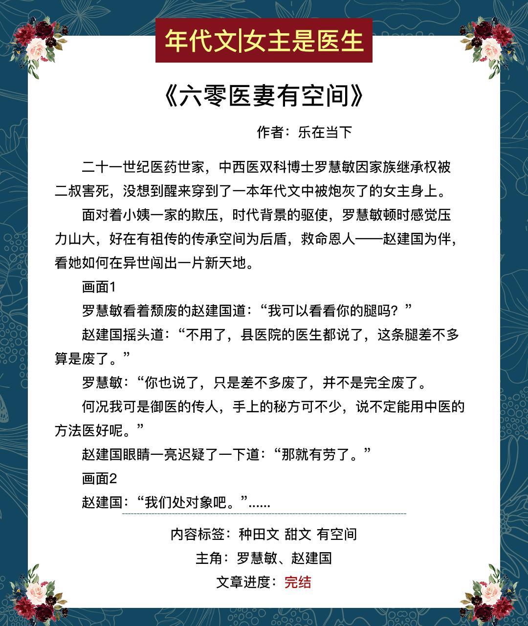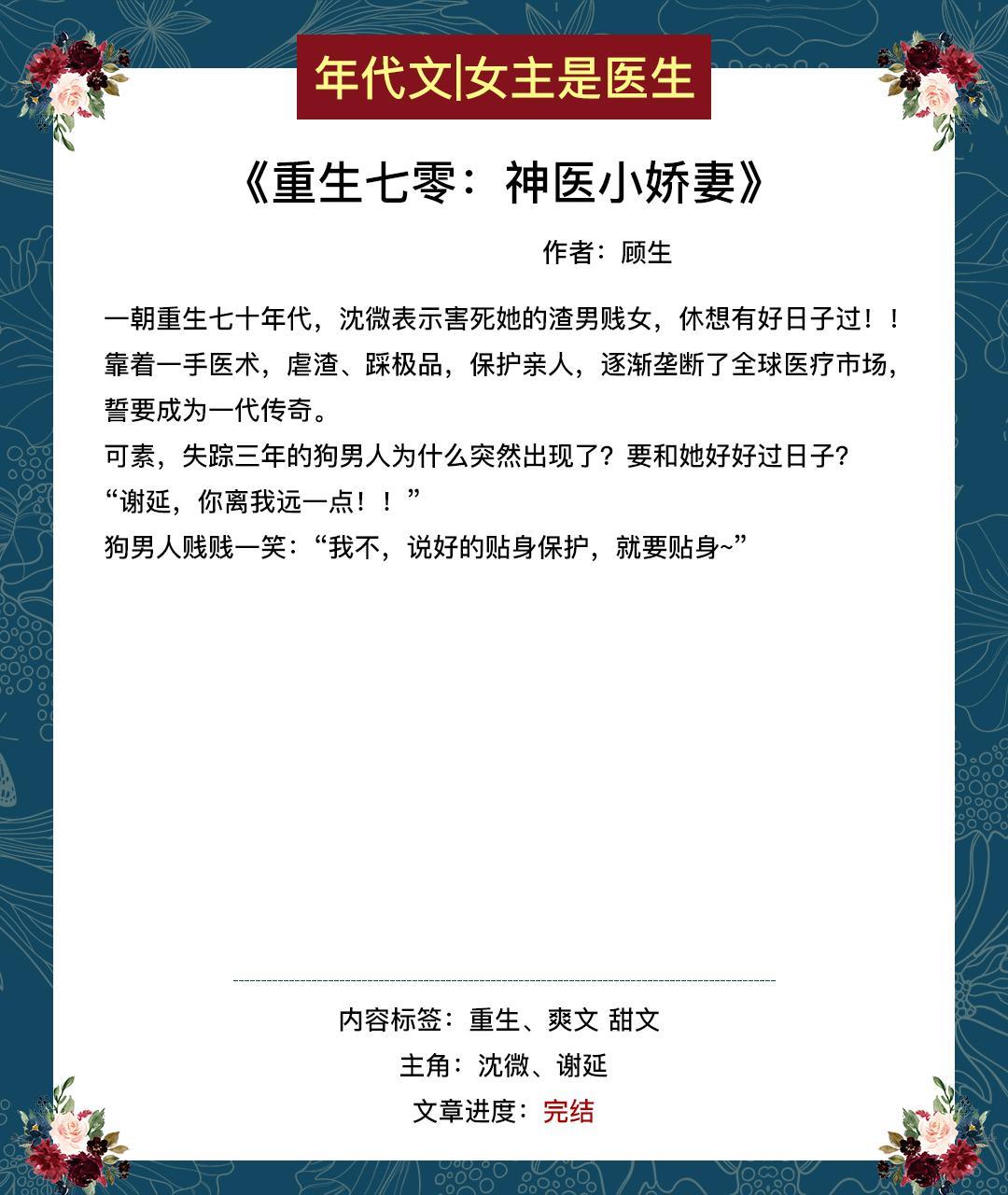这期给大家推女主是医生的年代文或带医神系统,或带药田空间。