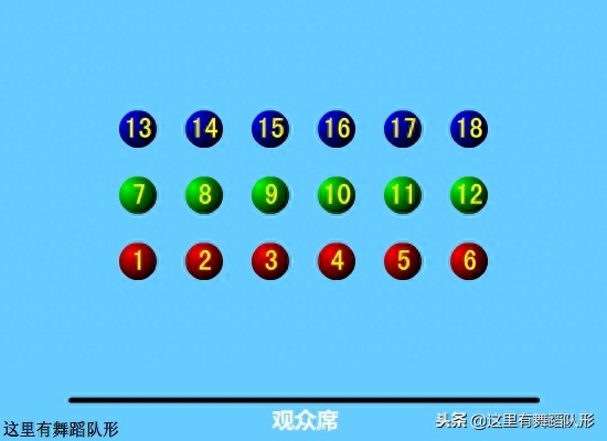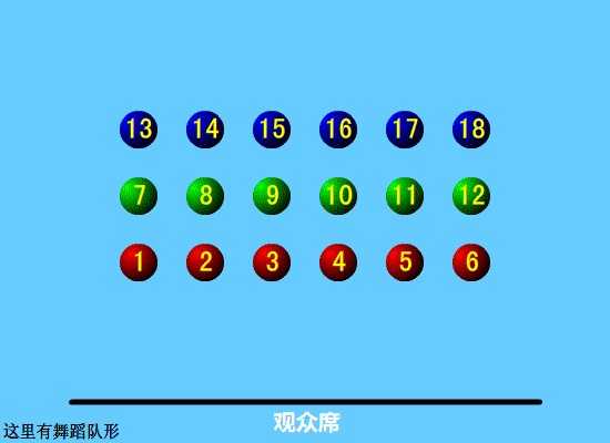 4、前排出来三人一组分出两组,后面错位站位。也可左侧的①⑦⑬和右侧的⑥⑫⑱分出来,中间其余人组成三角、V等队形。