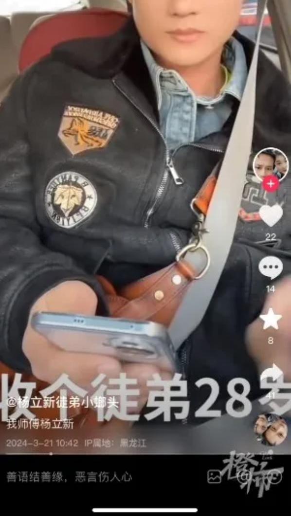 " 小螂头 " 的第一条视频作品是 3 月 21 日发布的,视频内容杨立新收徒,画面上,杨立新说:" 我把徒弟接来了,下午 3 点多到的 "," 小螂头 " 说自己 28 岁。