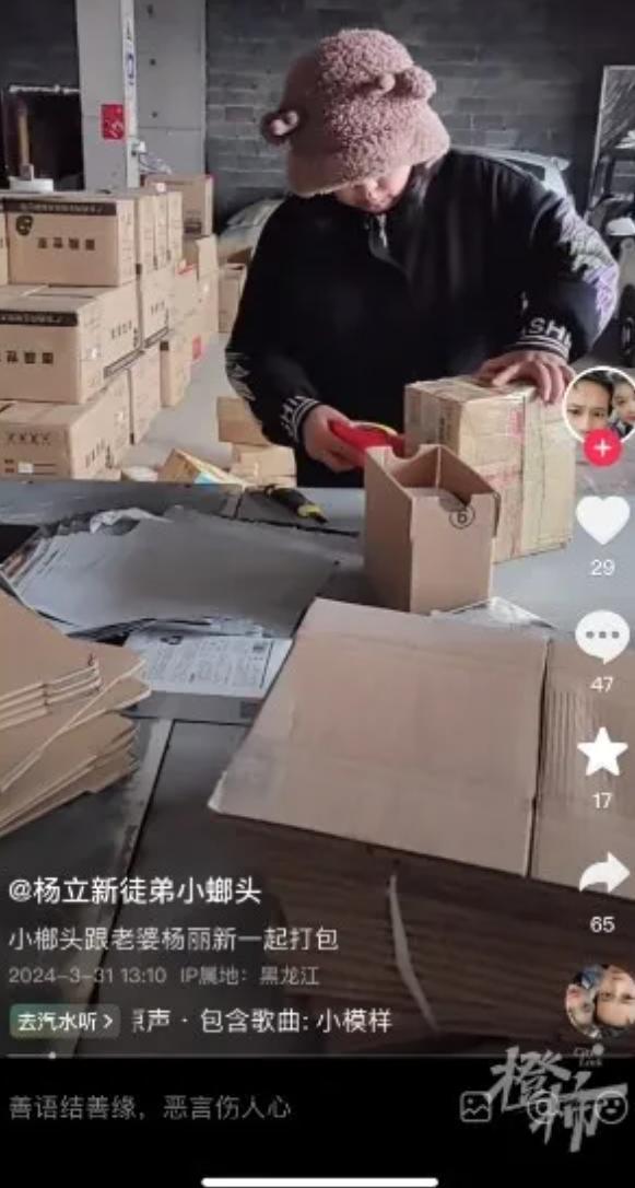 " 小螂头 " 抖音 ID 名字称自己是 " 杨立新徒弟 ",粉丝 4400 多,该账号短视频内容更新到 3 月 31 日,内容为小螂头和杨立新两人一起打包快递盒。