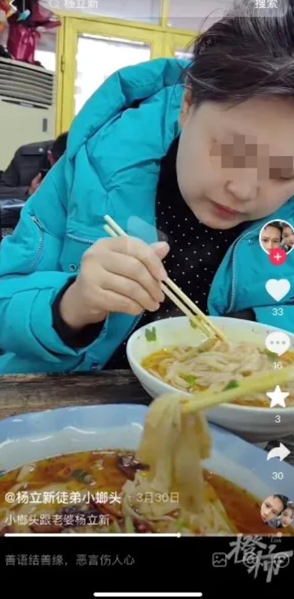 3 月 30 日,该账号发布内容是杨立新在吃面,还有夹面喂面的场景,画外音里,一个男声说:" 媳妇,来吃我的面条。"