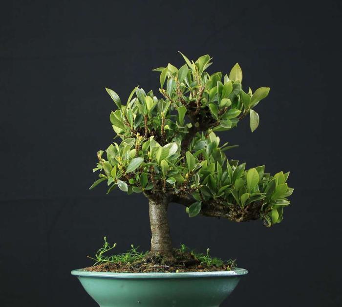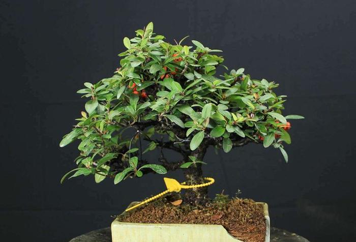 火棘自然矮霸大树型,造型很是优美,品种很棒,功底深厚,开白花,已挂小果