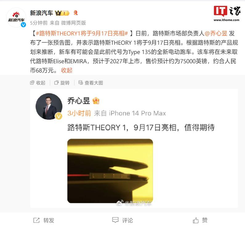 IT 之家 9 月 11 日消息,路特斯市场负责人乔心昱今天发文宣布,路特斯旗下最新车型 "THEORY 1" 将于 9 月 17 日亮相。