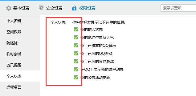 第四步、在具体的设置选择页面我们根据自己的需要取消或者勾选相应的选项状态就行了,状态包括我的输入状态、地理位置及天气、正在播放的音乐、正在玩的游戏、我的课程、以及公益活动的等状态信息。
