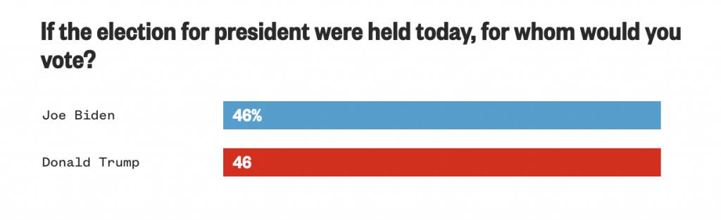 最新民调还显示,在 2024 年的假想大选中,拜登和特朗普在登记选民中的支持率均为 46%。相比之下,今年 6 月,拜登以 49% 对 45% 的支持率领先特朗普 4 个百分点。
