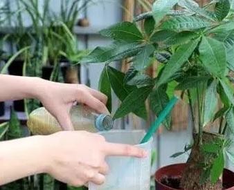 3、发财树喜肥,5~9月为生长期,15天施肥一次,采用腐熟的液肥或混合型花肥,可促进根深叶茂。