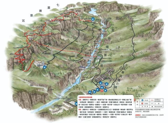 线路1:游客中心—乘景交车—七星寨倒灌水入口—游览七星寨景区—返程中心—乘景交车—游客中心