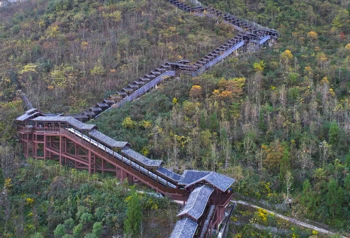 搭乘手扶电梯,游客置身其中既可舒缓前段路程游玩的疲惫,又可随着高度及角度的变化,变换视角,欣赏不同层次的丰富景色。