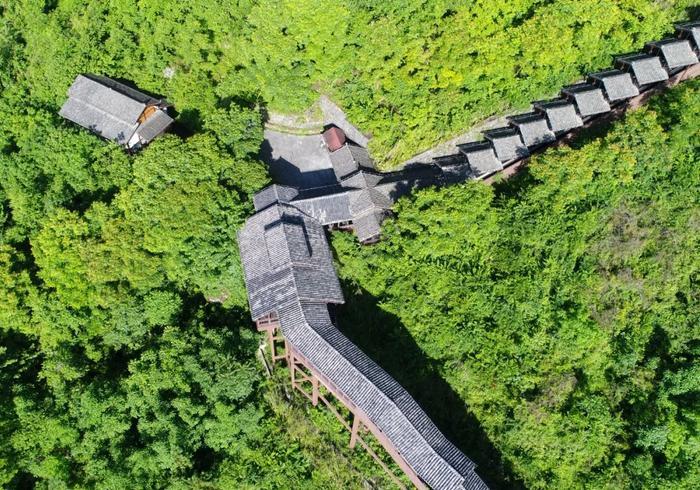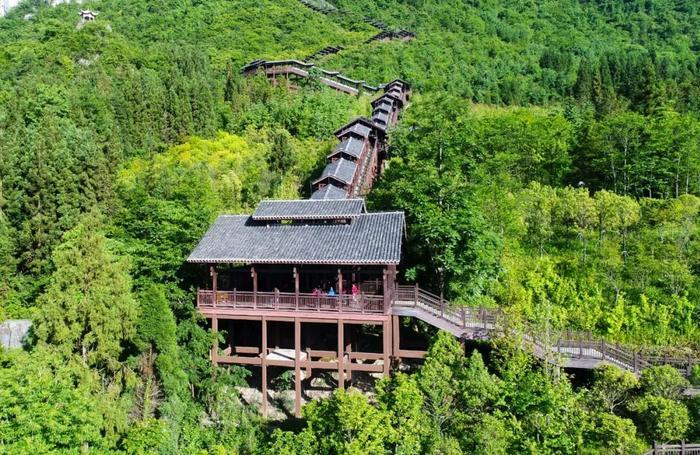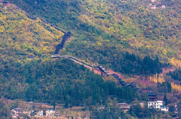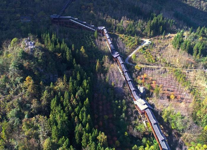 恩施大峡谷景区有一条户外手扶电梯,绵延在七星寨大楼门下的苍莽山野间,时隐时现,气势磅礴,被誉为“亚洲第一梯”“山野卧苍龙,气势贯如虹”。
