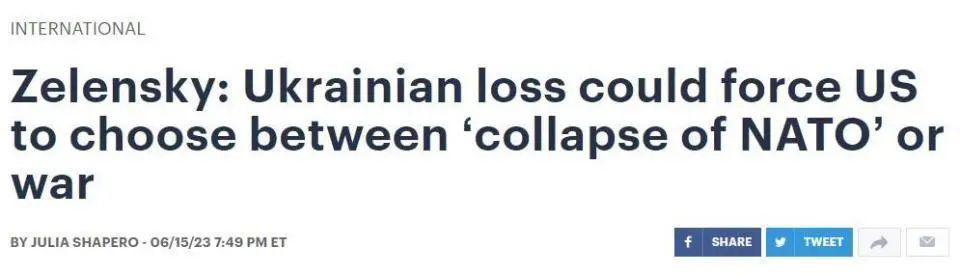 当地时间 15 日,泽连斯基在接受美国全国广播公司(NBC)采访时对美方喊话称:" 如果乌克兰输了,如果俄罗斯占领了乌克兰,俄罗斯将会继续向波罗的海国家、波兰等国挺进。他们将与某个北约成员国开战,到那时,美国将不得不在北约解体或开战之间作出选择。"