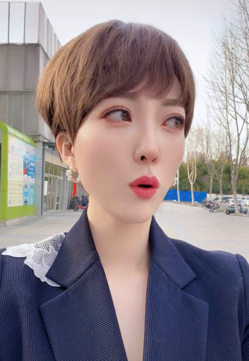也许是美颜滤镜太严重,余声的五官比例变得有些不协调,她的眼睛格外大,下巴又很尖锐,巴掌脸就显得头更大了。余声的发量本来就比较多,短发增加了她的头颅高度,气质变得老练了起来,也有些显老。