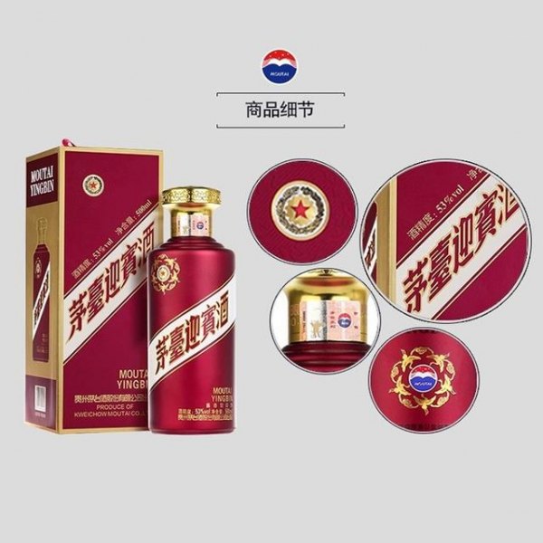 香型介绍:茅台迎宾酒属于酱香型酒,酱香型酒采用高温制曲,二次投料,堆积发酵的生产工艺,一般一年为一个生产周期。取酒后经过勾兑、陈贮而成。其酒味呈酱香、窖底香、醇甜香而具独特风格。酒体完美,香气幽雅,酒味丰满、醇厚。