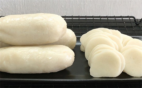 第五步:取出定型变硬的年糕,撕去保鲜膜,切成薄片,油炸或直接炒都很美味哦。