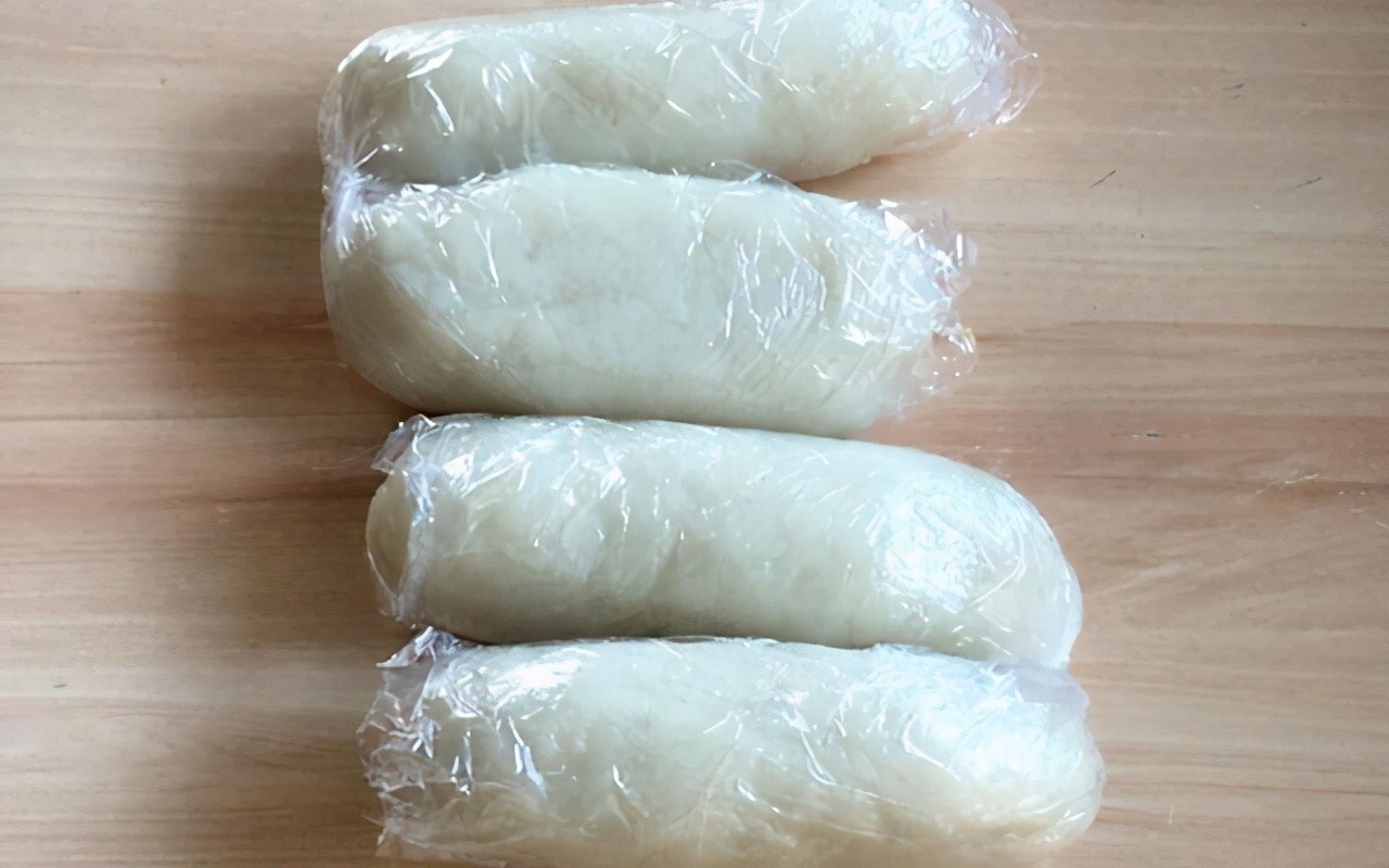 第四步:把揉好的面团分成四个剂子,揉匀后再搓成条;接着用保健膜把剂子裹起来,放入冰箱冷藏,定型后就变硬了。