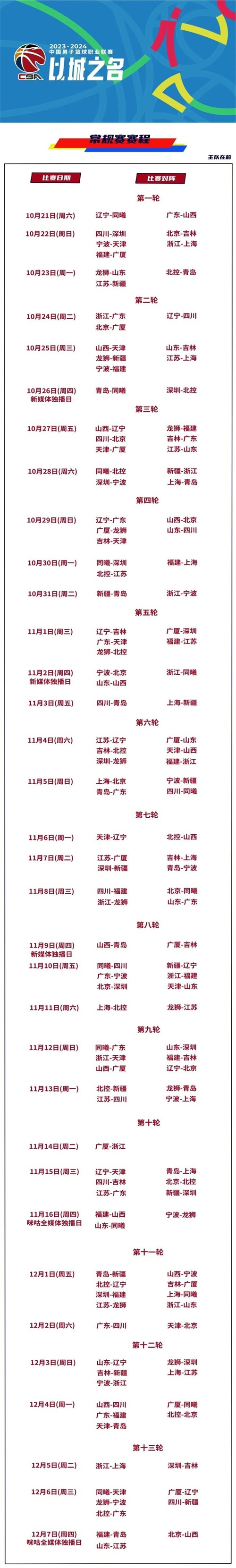 2023-2024赛季CBA联赛常规赛赛程正式公布!新赛季常规赛共52轮,揭幕战将于10月21日在辽宁本钢和南京同曦之间举行,收官战10场比赛将在2024年4月6日同时打响。以城之名,不负使命;与城同心,为城市荣耀而战!