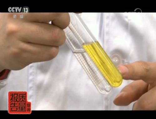 任航:如果是样品含有甲醛的话,它的颜色会发生类似这种黄色,我们经过测试这个样品确实是甲醛超标,它的颜色也非常深。