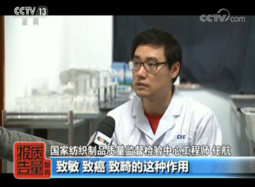 国家纺织制品质量监督检验中心工程师任航:我们国标中,对可分解致癌芳香胺染料的限定都是禁用的。这类可分解致癌芳香胺主要是用在染料中,染料在正常穿着的过程中会分解出致癌芳香胺,致癌芳香胺会通过皮肤被人体吸收之后,会对人体产生致敏、致癌、致畸的这种作用。