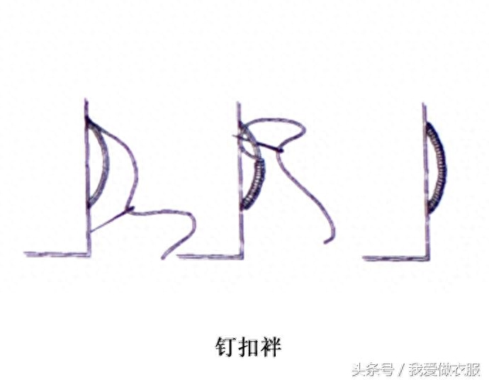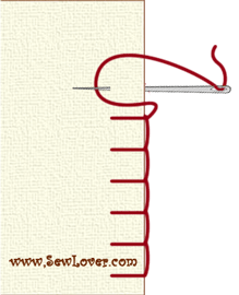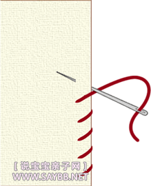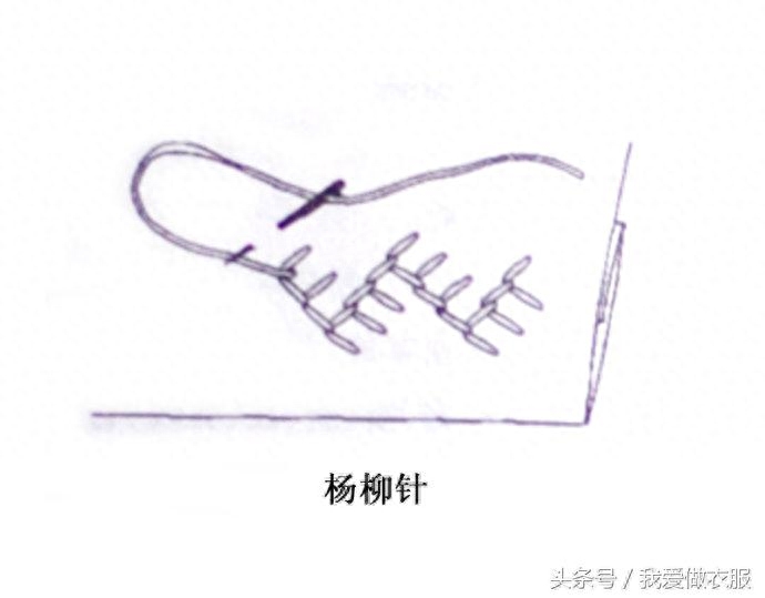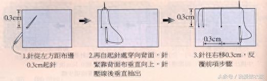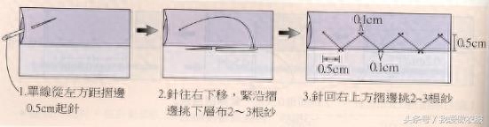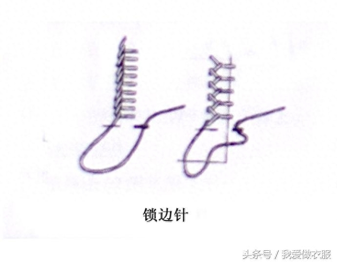 这是锁住裁片毛边的缝纫法,无锁边机或需要补修锁边时使用手工锁边针法。其操作方法是用左手食、拇二指捏住布边,右手持针,从左往右,一一套的顺序进行锁边。