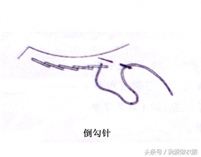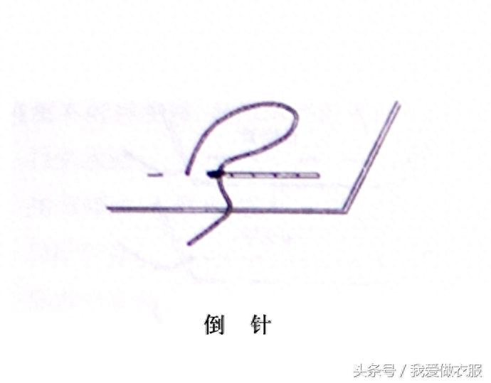 俗称扣针,又称缉针。先向前运一针(针迹约0.3量米),然后后退一针(约0.9厘米),针迹略为斜势。由于此针法比较牢固,所以拼合裤后缝、装袖窿时常用。