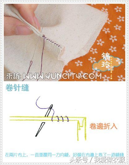 缲(qiao):把布边往里卷进去,然后藏着针脚缝。