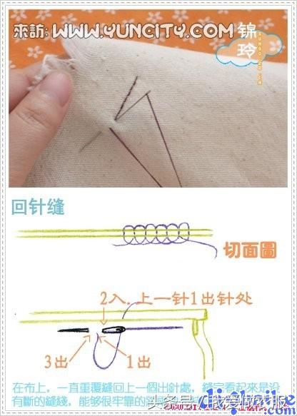 这是类似于机缝而且最牢固的一种手缝方法,用这种方法可以缝合拉链、裤裆、包包等牢固度要求较高的地方。同样适用于布块拼接,在不织布玩偶中较常用,这种缝法很结实。回针缝还分为全回针缝和半回针缝(多用于缝制拉链)。