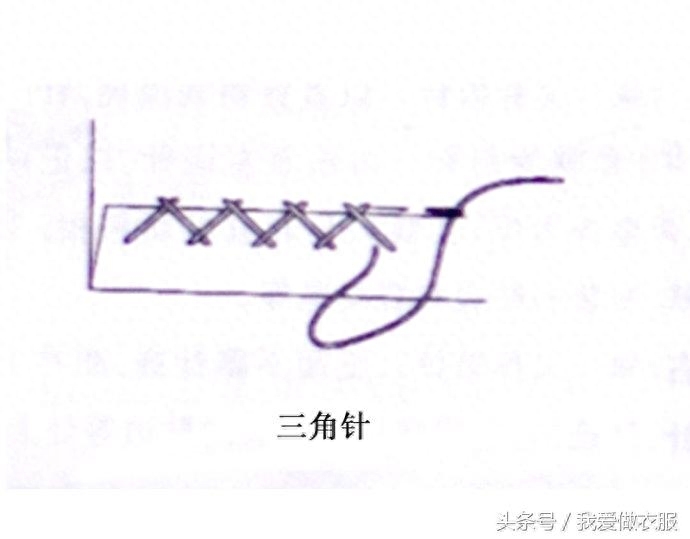 千鸟缝(三角缝):亦称花绷,俗称狗牙针。用于固定衣服的袖口边、底边及裤边等。这个应该很熟悉的,大家穿的西装裤脚边里面都是这样的吧。从左至右运针。正面不露线迹,反面针迹呈交叉之势。